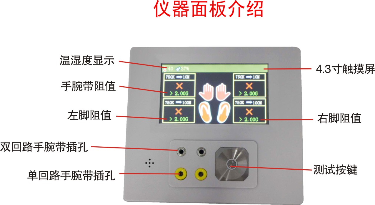 本數(shù)顯式人體靜電測試儀是我司研發(fā)的一款高科技的儀器,產(chǎn)品亮點在于:配3.4寸的觸摸屏,可顯示防靜電鞋子和手腕帶的電阻值;中英文菜單和語音提示等功能。一臺儀器可兩用,壁掛型和升降型二選一。在使用過程中只需把手指放在感應(yīng)觸摸按鈕上一秒鐘,聽到“滴”的一聲提示音,彩色液晶屏上即顯示測試結(jié)果,同時語音會提示:(測試合格/測試不合格)測試結(jié)果可顯示到小數(shù)點后兩位,是目前市面上同類型產(chǎn)品中準(zhǔn)確度較高的一款測試儀,測試精度在量程范圍可保證在±10%以內(nèi)。